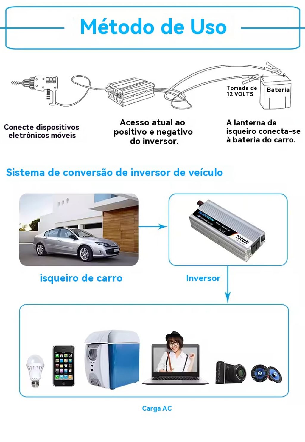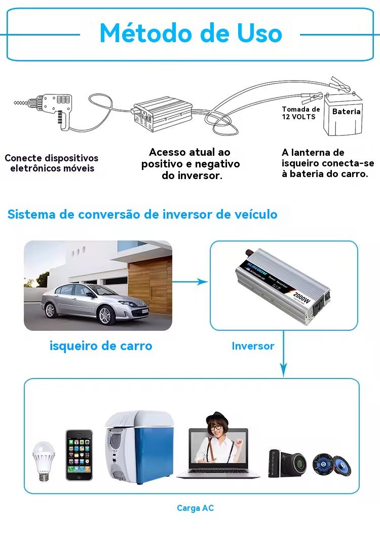 Coloque no carro para ligar celulares, laptops ou evenadores durante viagens longas (como de Luanda a Huambo) — útil para motoristas ou quem viaja com equipamentos eletrônicos.